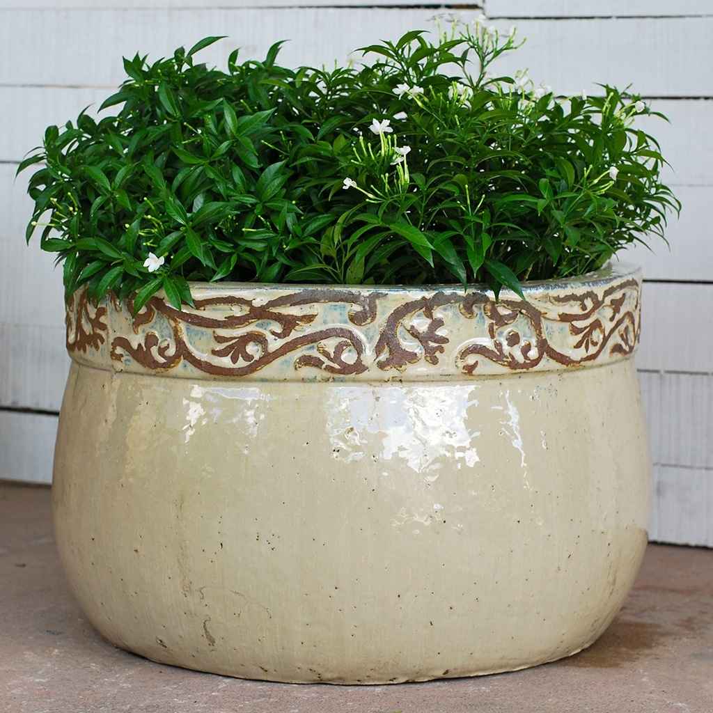 The Scrolled Rim Planter from TT Pottery combines timeless design with practical function. Its broad, rounded body offers generous planting space, while the ornate rim band adds a refined decorative touch. Crafted from durable, high-fired ceramic, this planter withstands seasonal changes, making it ideal for both residential gardens and large-scale landscape projects. The neutral glaze enhances its versatility, allowing it to complement a wide range of plants and design settings. Retailers and garden centers will appreciate its eye-catching appeal and classic styling, which make it a strong resale item. Landscapers can use its wide proportions to anchor outdoor spaces with vibrant flowers, shrubs, or lush greenery. A blend of elegance and durability, this planter enriches any display or garden.